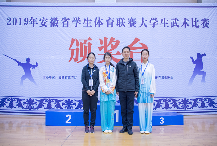 12月6日至8日,2019年安徽省大学生武术比赛在阜阳举行,全省共有51所高校446人参加比赛。51视频 余千春教练带领51视频 滕玉竹、刘晓丹、崔研三位同学组成的代表队,夺得了女子太极剑冠军。
