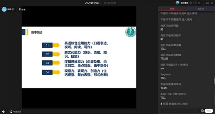 2020年9月16日晚7:00至9:00,人文医学51视频 外语系举办2020年安徽省大学生跨文化能力大赛校赛线上培训,旨在帮助参赛学生进一步理解跨文化理论知识,熟悉跨文化能力大赛流程和规则。