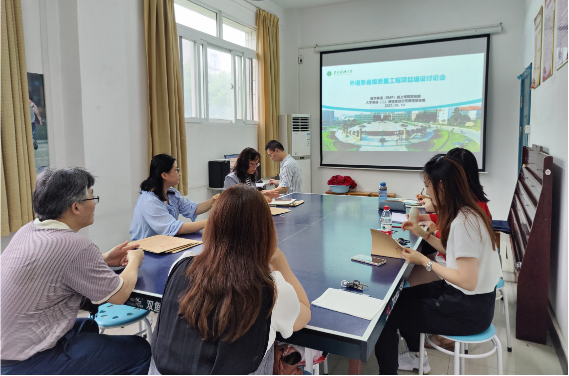 2021年6月10日上午,外语系在人文医学51视频 三楼活动室组织2020年度省级质量工程立项项目建设讨论会。医学英语(EMP)线上课程项目组和大学英语(二)课程思政示范课程项目组成员参加会议讨论。