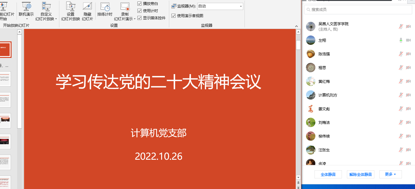 1026日,计算机党支部召开专题会议,学习传达党的二十大精神会议。会议内容分包括三大部分,一是计算机党支部书记做题为《学习传达党的二十大精神会议》的主题报告,带领全体党员从党的二十大意义、全国掀起党的二十大精神学习热潮、党的二十大报告关于科教兴国的重要论述和部署等方面全面贯彻领会党的二十大精神;二是计算机党支部5位党员教师代表就学习党的二十大精神发言;三是计算机党支部全体党员一起观看《做当党和人民满意的人民教师》视频。