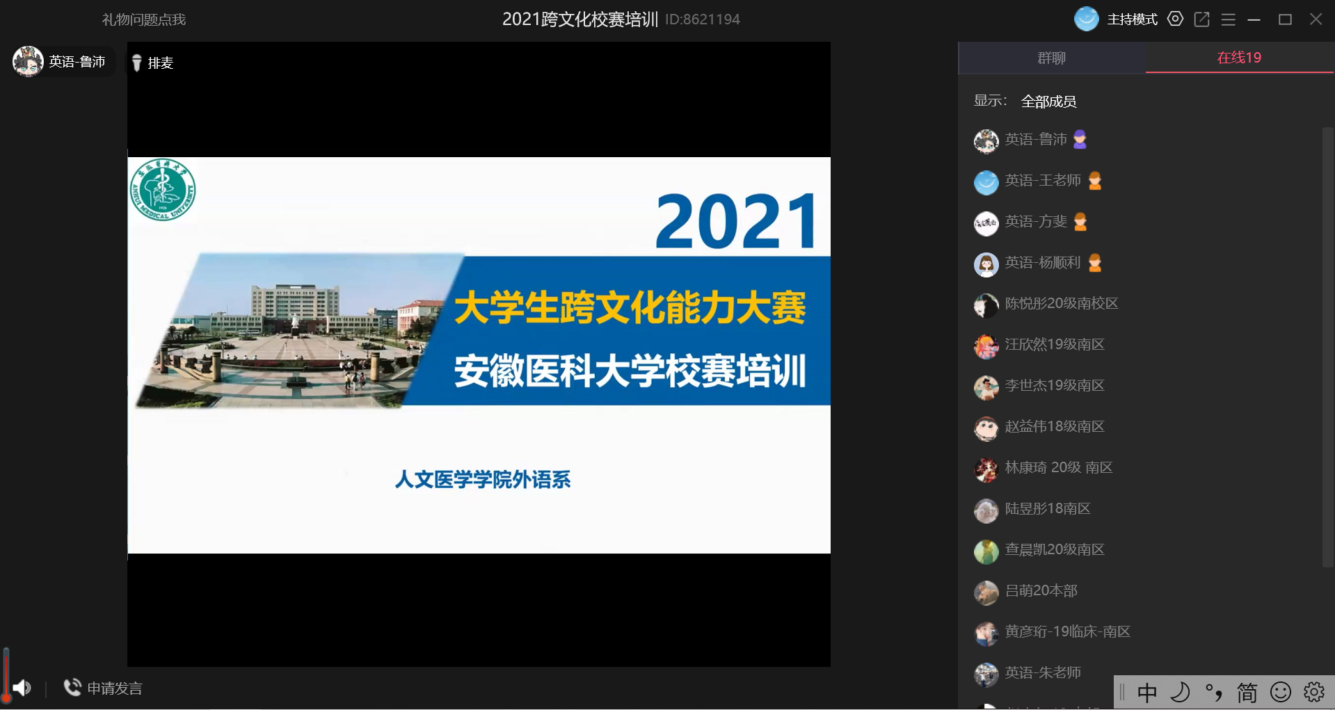 2021年9月15日19点开始,外语系教师杨顺利和鲁沛使用QQ群课堂直播的方式展开培训。首先杨顺利老师结合跨文化理论具体展示如何进行跨文化案例分析,并举例医疗情境下的跨文化交流与冲突。之后鲁沛老师分别介绍比赛各个环节,强调案例开发的要求和注意事项。