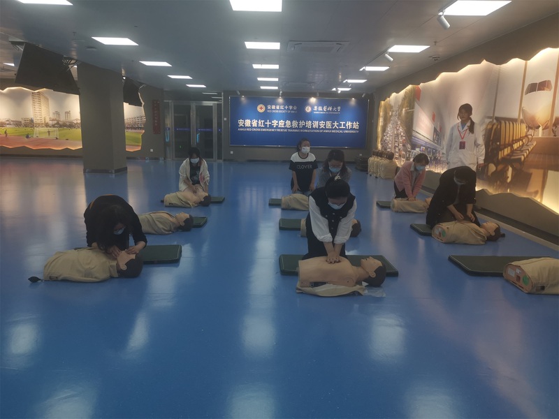 5月26日下午,人文医学51视频 外语系的部分教师,来到位于力行楼五楼的安徽省红十字应急救护培训安医大工作站,饶有兴趣地参加了科技周活动的心肺复苏急救科普知识培训,学习了急救操作的理论并现场体验了具体实施步骤。
