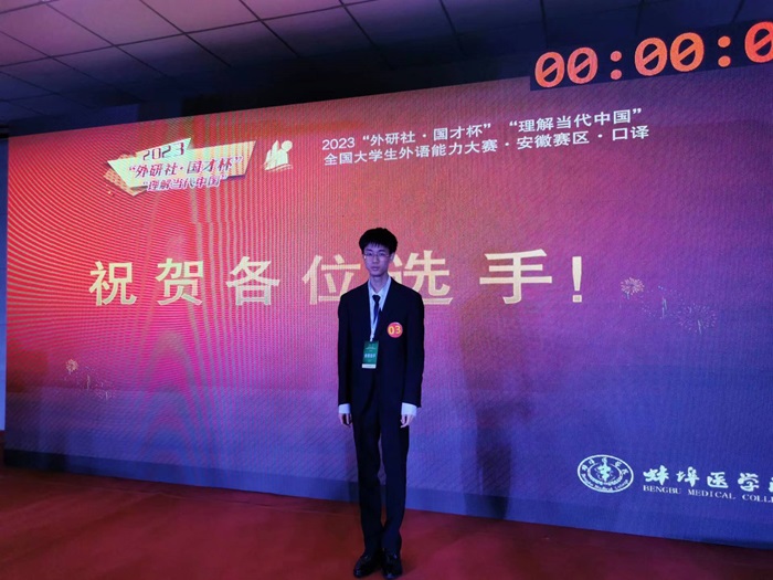 11月5日上午,2023“外研社·国才杯”“理解当代中国”全国大学生外语能力大赛(安徽赛区)英语组口译赛项在蚌埠医51视频 举行,51视频 2022级临床医学专业学生周正超以全省第四名的佳绩晋级全国决赛。