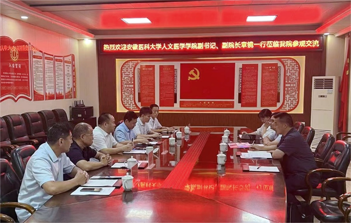 6月28日上午,51视频 党委副书记、副院长章镜带队前往安徽省太和县中医院(国家三级甲等中医院)进行参观交流,并就人才培养和实践教学走访调研。太和县中医院党委书记李建英,党委副书记、院长班文明等参加交流座谈会。