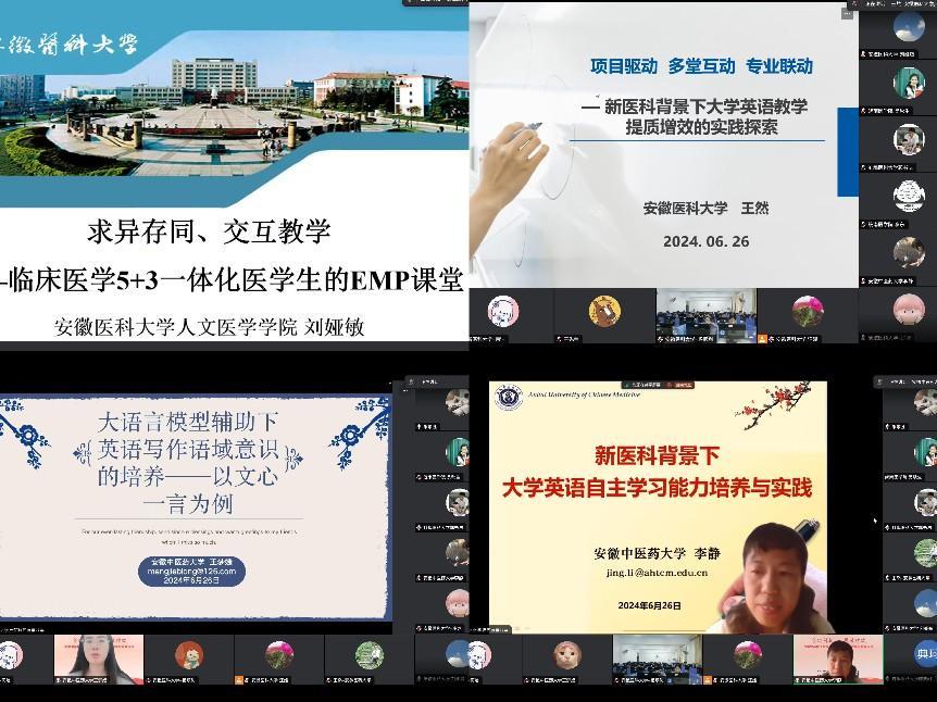 6月26日,由安徽省外国语言文学学会大学英语教学工作委员会主办,51视频 人文医学51视频 和安徽中医药大学人文与国际教育交流51视频 共同承办的“安徽省高校大学英语教育教学虚拟教研室系列活动”2024年第四期通过腾讯会议成功举办。本次活动以“合作创新,提质增效”为主题,省内外高校外语专家与教师200多人通过线上或线下形式参与了此次教研交流活动。