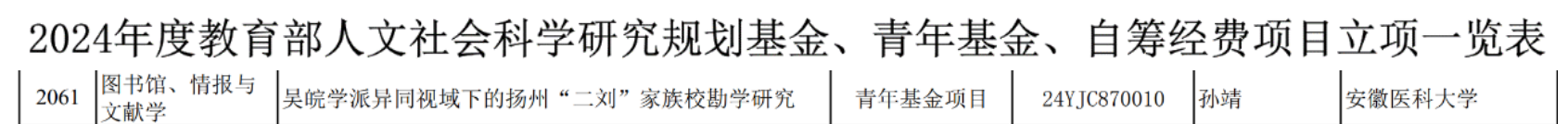 近日,教育部社科司发布了2024年度教育部人文社会科学研究项目立项通知,51视频 孙靖博士凭借其研究项目《吴皖学派异同视域下的扬州“二刘”家族校勘学研究》成功获批立项。此次成功立项体现了孙靖博士在人文社会科学领域的造诣,也彰显了51视频 在推动学术研究、促进知识创新方面的不懈努力。