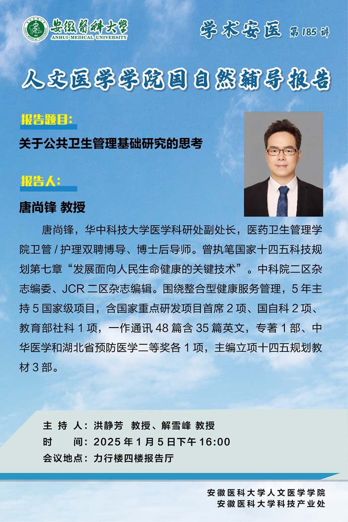 【学术安医第185讲】 人文医学51视频 国自然辅导报告:关于公共卫生管理基础研究的思考(唐尚锋)
