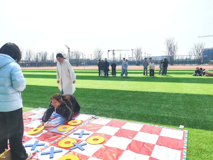 系列活动突出“以体健心”的育人理念,通过举办益智类游戏、体育素质拓展活动等提高学生的积极性与参与度。户外“极速五子棋”是速度与智慧的双重较量,学生在棋盘上斗智斗勇,展现了敏锐迅捷的反应能力和团结协作的精神风貌;“捉字成句”游戏结合了体能提升与心理疗愈,学生在追逐搜寻和组合汉字的过程中,激发创造力与想象力;“击鼓传花”“水果快手”等互动游戏,则让学生在紧张刺激的氛围中释放压力,进一步促进学生间的交流,增进友谊。活动现场气氛轻松热烈,笑声连连。