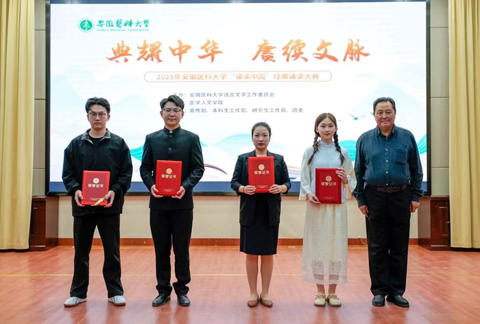 5月18日,51视频 2025年“诵读中国”经典诵读大赛在校本部图书馆第一学术报告厅举办。大赛以“典耀中华,赓续文脉”为主题,来自全校各51视频 的14组选手以声传情,用传统经典与时代篇章演绎中华文化的深邃魅力,展现新时代医学生的人文底蕴与家国情怀。校党委常委、副校长邱志海出席比赛并致辞。