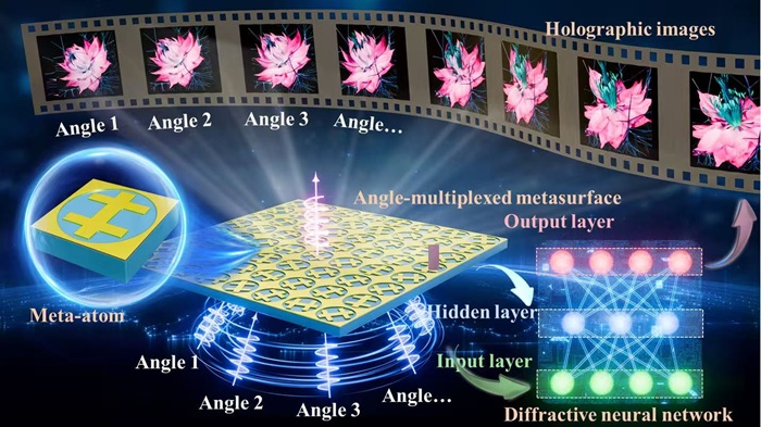 该研究聚焦于人工智能与信息光学的交叉融合,提出并实验验证了一种基于衍射神经网络(Diffractive Neural Network, DNN)的角度复用全息超表面结构,为突破传统光学系统中“角度光学记忆效应”带来的信息冗余瓶颈提供了新思路。通过全局优化超表面相位分布,团队实现了在不同入射角下的高保真图像复原,显著提升了多通道光学信息编码能力。该设计采用兼容单层制造的几何相位结构,兼具工程可实现性和广谱鲁棒性,未来有望在增强现实、信息加密通信以及多视角显示等前沿领域发挥重要作用。