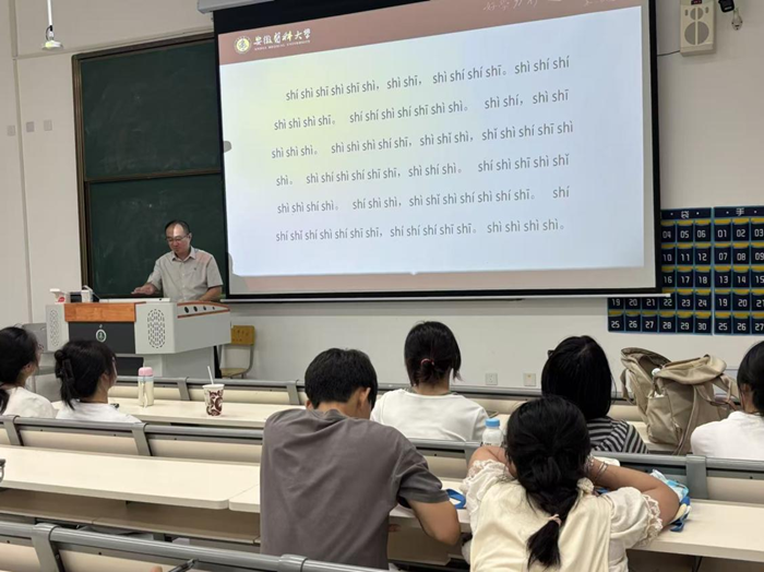 “声”情并茂,师生相约语言文化课堂9月17日下午,为增强同学们的普通话能力,医学人文51视频 特邀请安徽省普通话水平测试员路洋副教授为同学们开展了一场名为“普通话的习与练”专题讲座。路老师通过对比方言与普通话的差异,剖析了普通话语音、词汇、语法方面的规范标准。他辅以生动有趣的实例,指出了日常生活中常见的语音错误和用语误区。针对在场学生存在的“n-l不分”“前后鼻音混淆”“轻声儿化掌握不佳”等问题,路老师进行了耐心的纠正,并设计了多个互动练习环节。最后,路老师以绕口令的形式带领大家齐读四声歌,带领同学们感受普通话的魅力,在场气氛热烈。